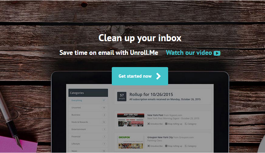 الخدمة تدعى Unroll و يتجلى دورها في مساعدتك على إلغاء الاشتراكات غير المرغوب فيها بطريقة سهلة و بسيطة، حيث كل ما عليك فعله و الدخول إلى الموقع السابق ذكره (رابط الموقع أسفل الموضوع) و الضغط على زر “Get Started” كما هو مبين في الصورة: